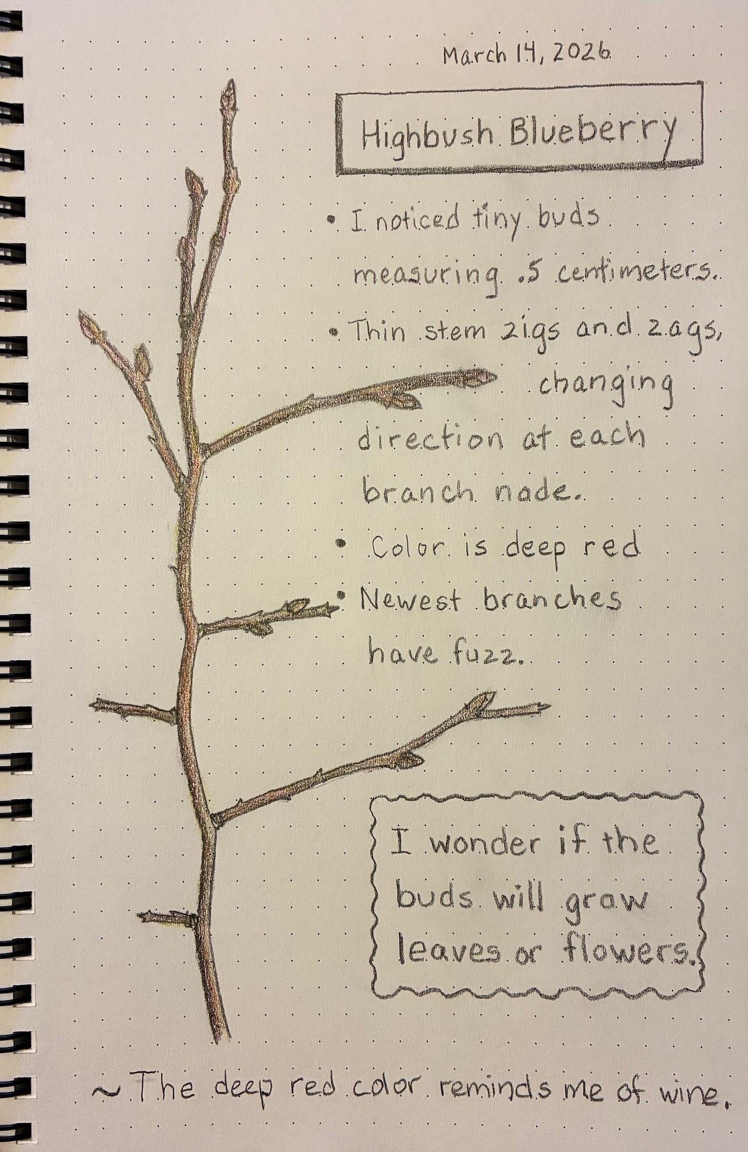 Get a sheet of blank paper and help your child/children write the date at the top. Then encourage them to draw a picture that represents what they see. I used my cutting to trace an outline of the blueberry stem onto a page of my new journal. Try freehand drawing and try tracing. Which works best? Connecting with plants in this creative activity is mindful, meditative, peaceful, and healing, if you seek healing.