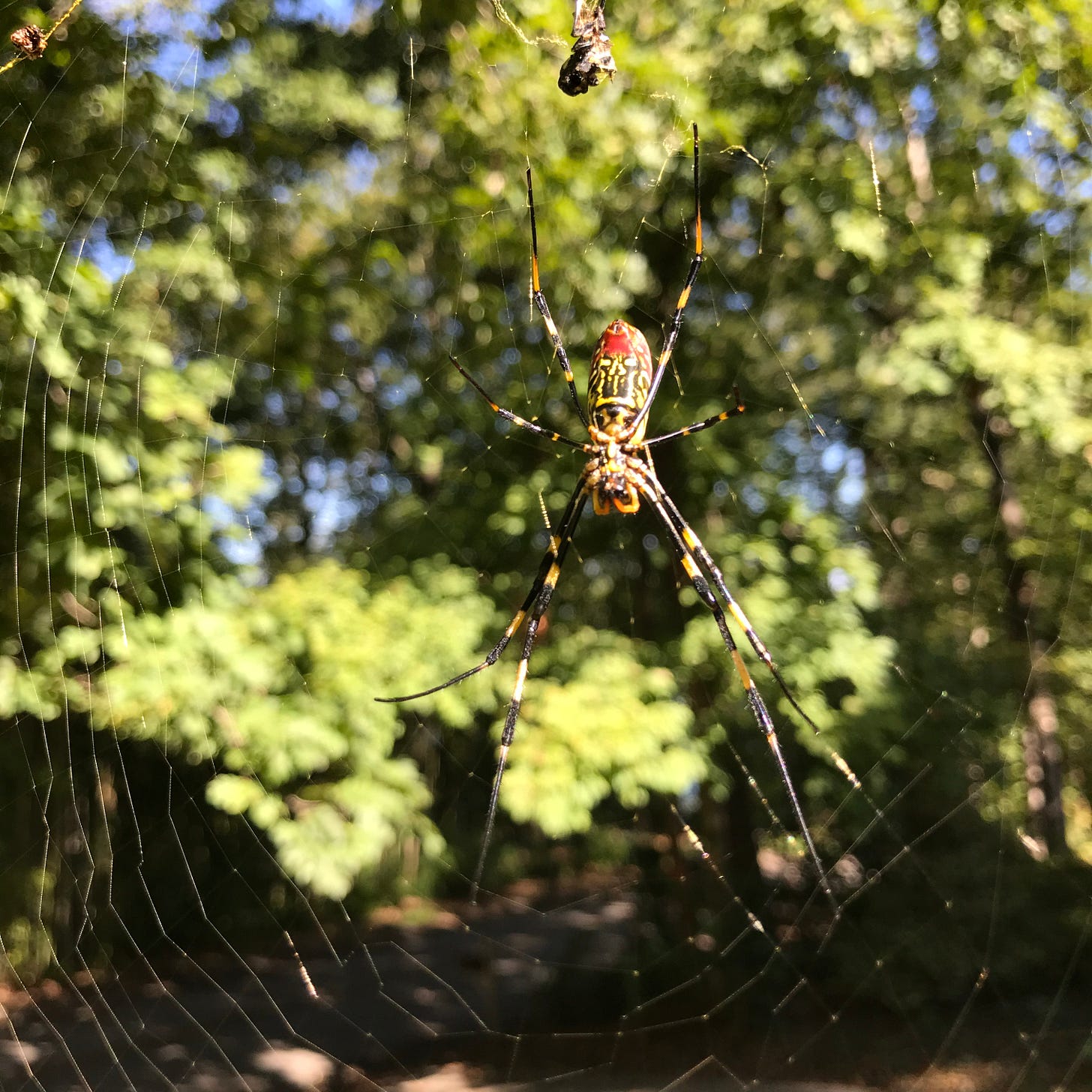 Is anyone wondering what species of spider spun this remarkable web? I showed the photo to a friend at church. He guessed the web was woven by a Writing Spider. I went online and looked up Writing Spider, Argiope aurantia, (Black and Yellow Garden Spider). Incorrect. The spider’s color markings and web designs were different. The spider on the web I photographed had red markings on its abdomen; it turned out to be a Joro Spider, Trichonephilia clavata or Nephila clavata.